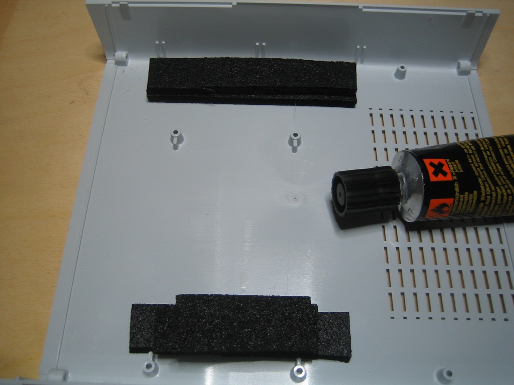 An der Stelle, wo das IDE-Parallelkabel ist, zwei Streifen ins Oberteil einkleben.